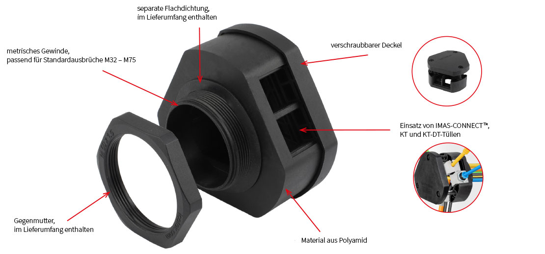 Leitungen von 1 bis 15 mm Durchmesser k?nnen eingeführt, mit IP54 abgedichtet (zertifiziert nach EN 60529) und zugleich gem?? EN 62444 zugentlastet werden. Das Verteilergeh?use passt auf metrische Standardausbrüche und wird mit einer Gegenmutter befestigt, die im Lieferumfang enthalten ist. Durch den verschraubbaren Deckel und die Verwendung von geteilten Kabeltüllen sind anschlie?endes Nachrüsten oder Servicearbeiten problemlos m?glich.