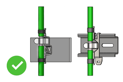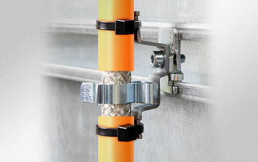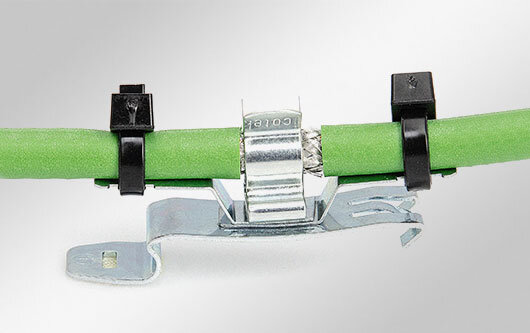 EMV Schirmklammern mit doppelter Zugentlastung für Rastmontage auf 35 mm Hutschiene.