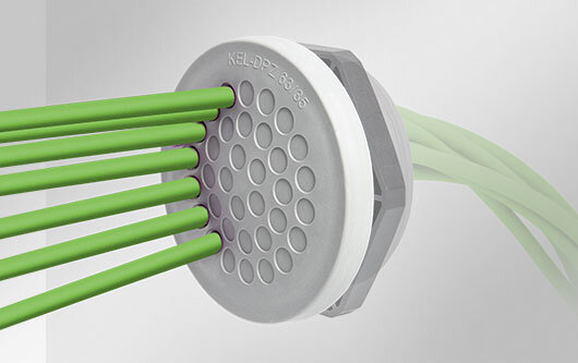 • Dependiendo del dise?o, las entradas de cable de la gama de productos KEL-DP se pueden encajar en recortes redondos rectangulares y métricos rápidamente y sin herramientas. Permiten también sellar los cables con grados de protección hasta IP65.