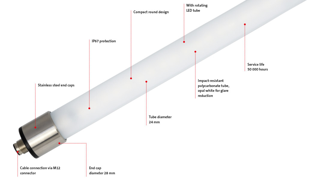 Het TUBE-systeemarmatuur biedt effectieve verlichting voor machines en apparatuur, met M12-connectoren voor gestandaardiseerde aansluiting.