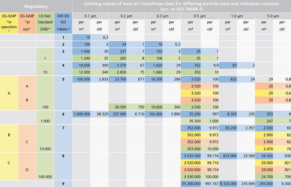 潔凈室根據(jù) ISO 14644-1 標(biāo)準(zhǔn)中的ISO 1 至 9 的等級(jí)分類。各個(gè)潔凈室等級(jí)可能僅包含一定數(shù)量特定尺寸的顆粒。 顆粒濃度通過(guò)每立方米空氣表示。 ISO 1 為最嚴(yán)格的規(guī)范要求,ISO 9 為最低規(guī)范要求。